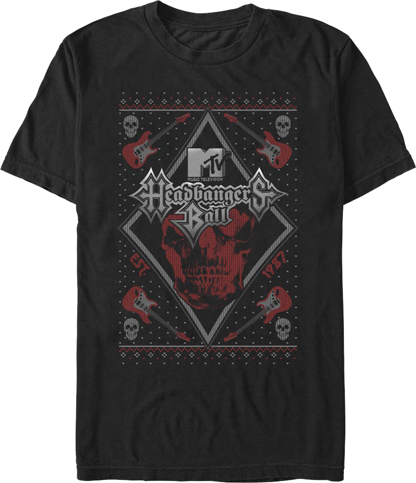 Headbangers Ball played heavy metal music videos from both well-known and more obscure artists. Headbangers Ball offered a stark contrast to Top 40 music videos shown during the series' run. Everyone will know you are a fan when you wear this Headbangers Ball Faux Ugly Christmas Sweater MTV T-Shirt!