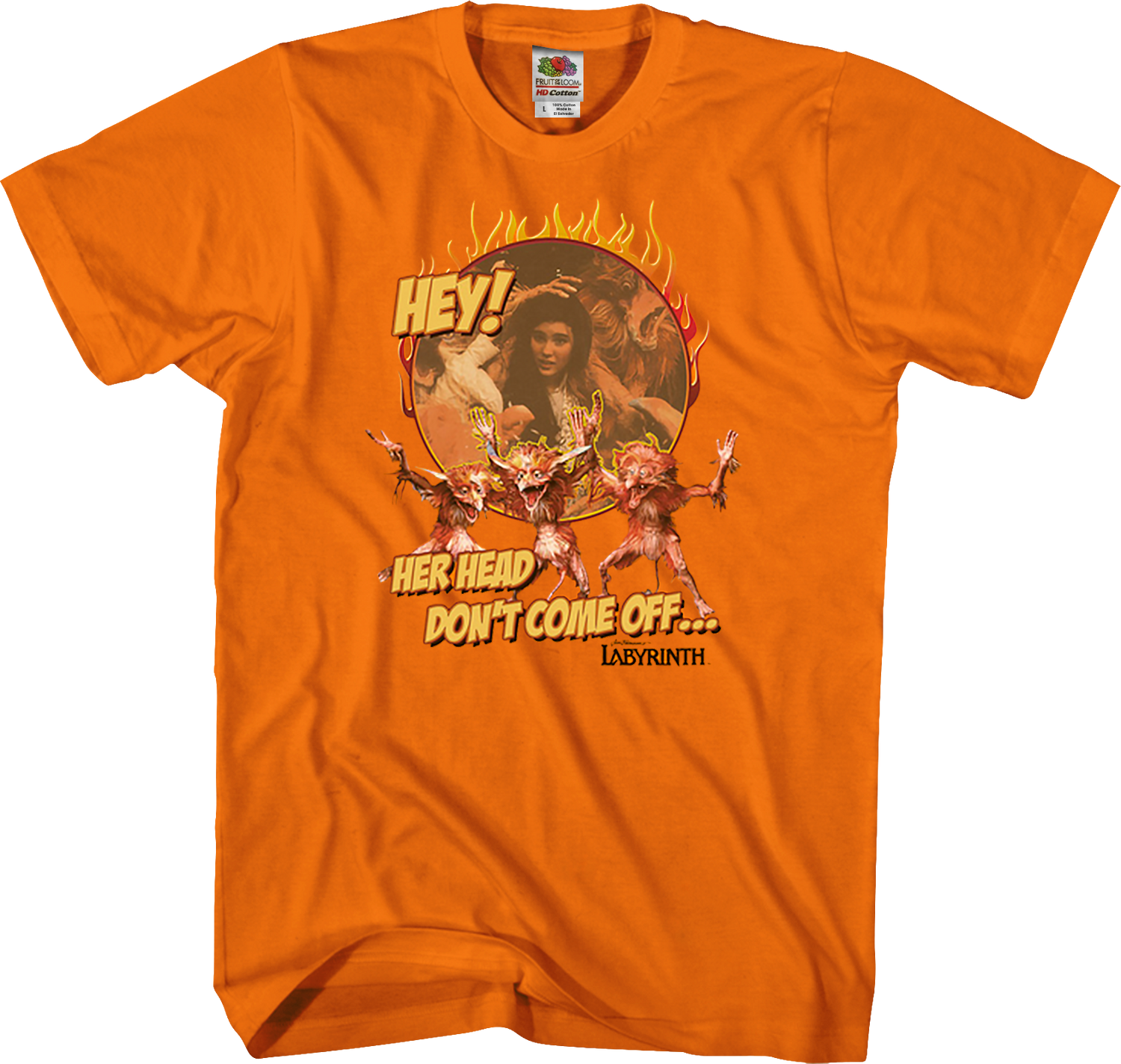 This Labyrinth t-shirt shows three Fierys and Sarah. The shirt reads Hey! Her Head Don't Come Off...
