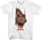 The possessed Good Guys doll Chucky is usually original in creating his own brand of horror and mayhem, but on this t-shirt, Chucky is seen imitating another horror icon. In The Shining, Jack Torrence chopped a hole in a door with an axe, peeked in the hole, and said "Here's Johnny!" This Child's Play t-shirt shows Chucky peeking through a hole and saying "Here's Chucky!"