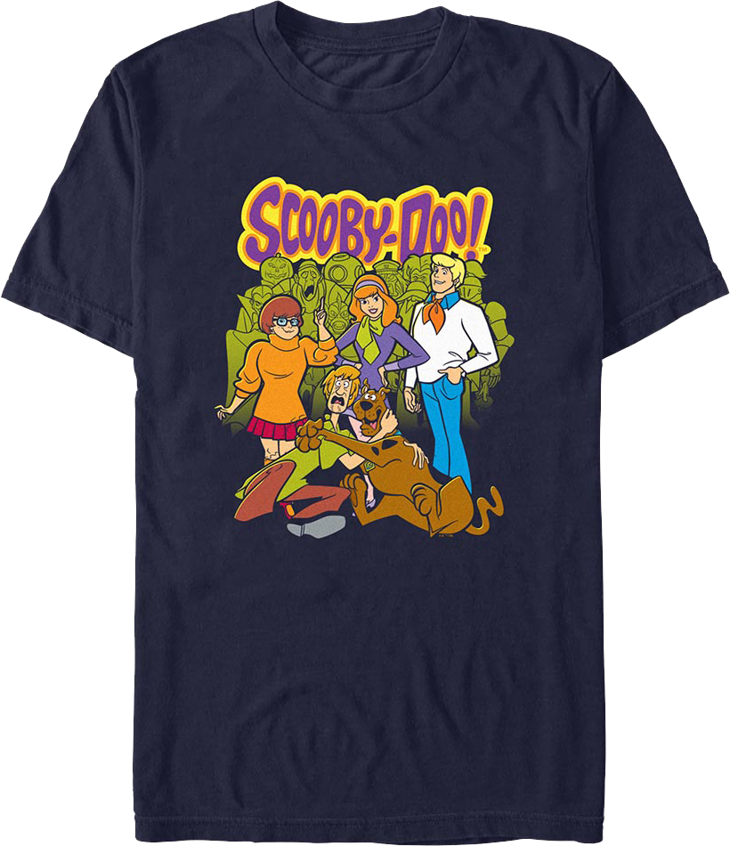This Scooby-Doo t-shirt shows some of the ghostly villains that Mystery Inc. has investigated positioned behind Velma, Daphne, Fred, and Shaggy and Scobby-Doo, who are seen hugging each other.