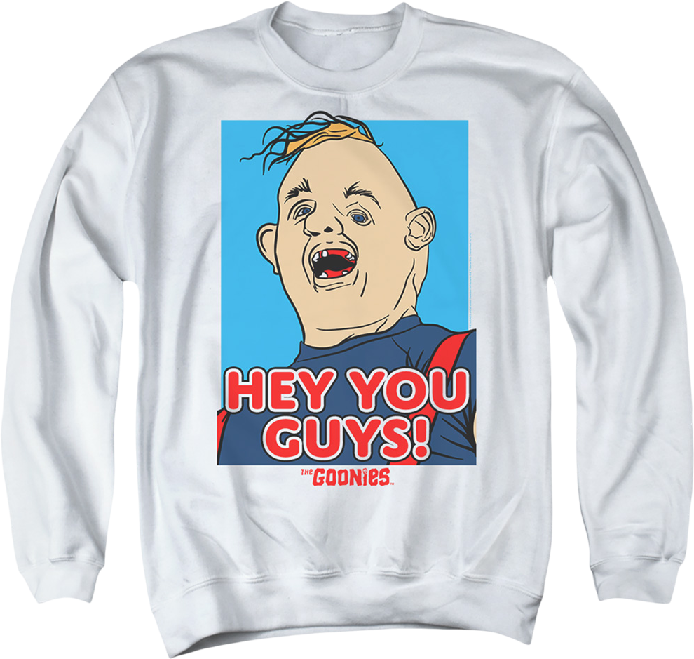 This Goonies sweatshirt features an illustration of Sloth Fratelli. The sweatshirt includes Sloth's classic quote, "Hey you guys!"
