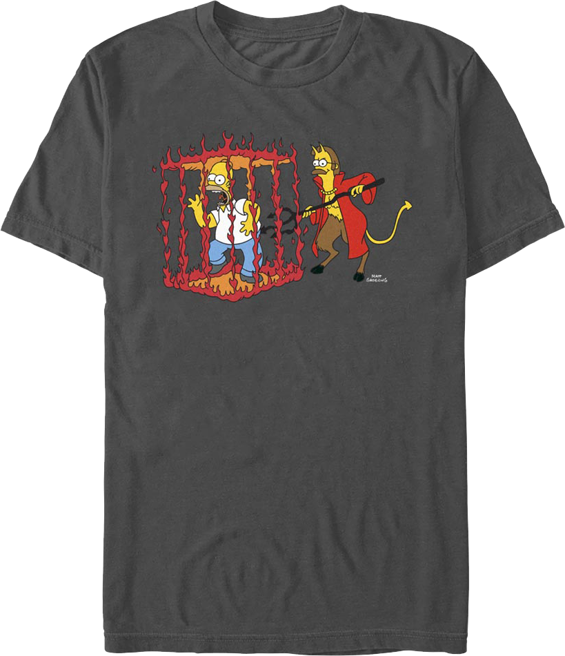 This Simpsons t-shirt shows Devil Flanders holding Homer Simpson in a flaming cage.