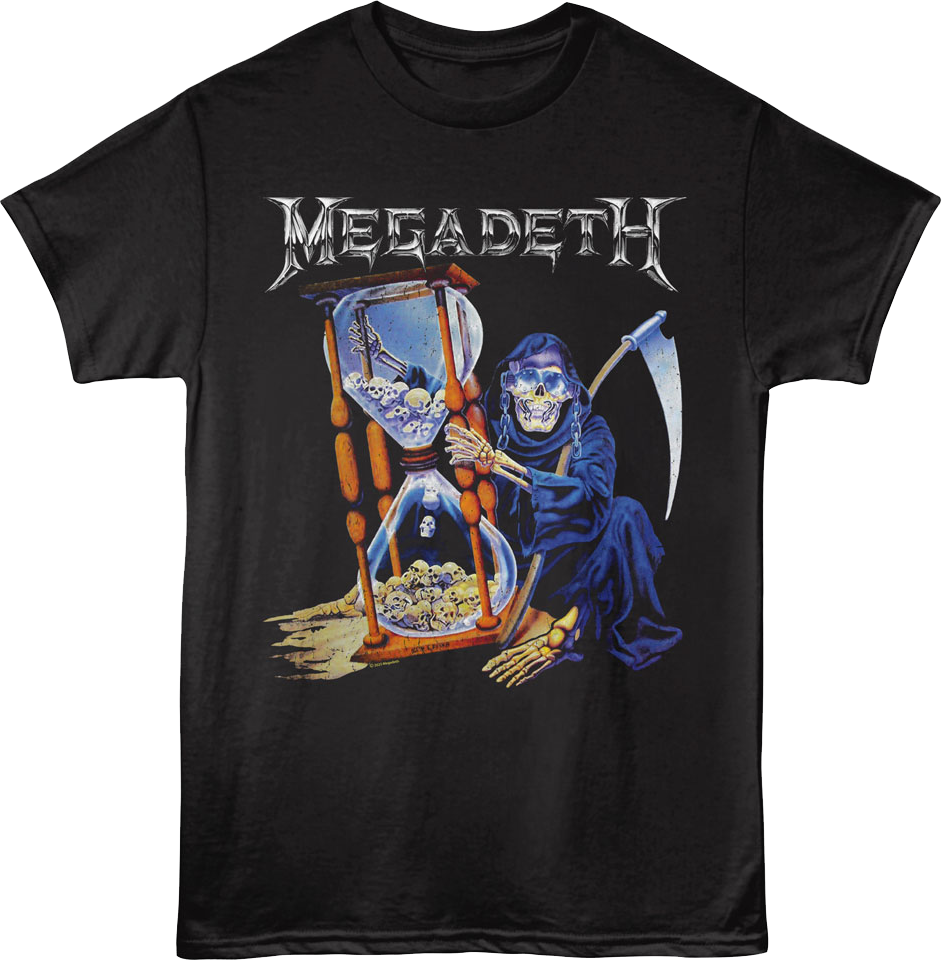This Megadeth t-shirt shows the band's mascot Vic Rattlehead wearing the Grim Reaper's robe and holding an hourglass that is filled with human skulls instead of sand.