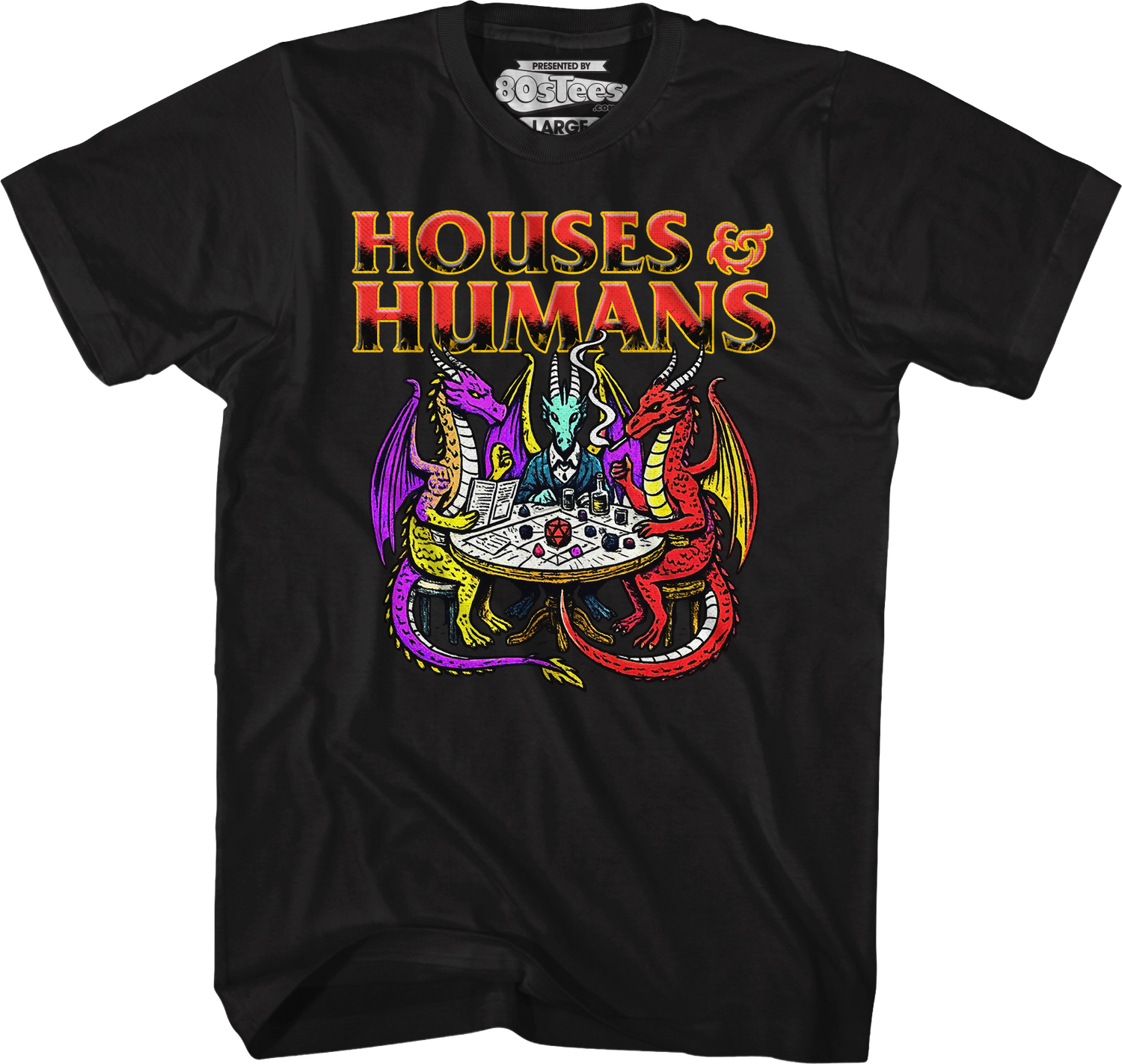 This 80sTees.com exclusive t-shirt shows dragons playing the role-playing board game Houses & Humans.