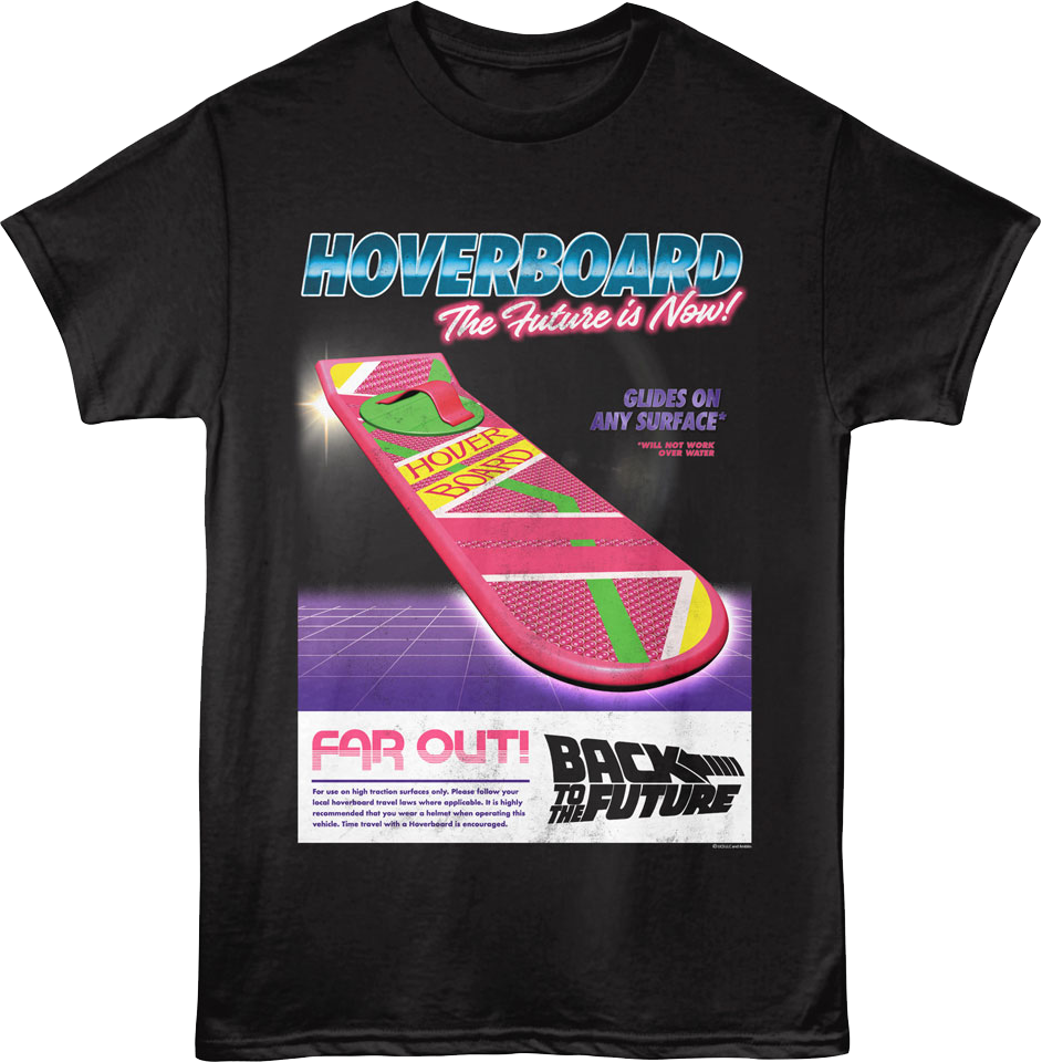 This Back To The Future t-shirt features a poster for the Hoverboard. The poster includes the slogan "The Future is Now!" and the disclaimer that the Hoverboard glides on any surface, but will not work over water.