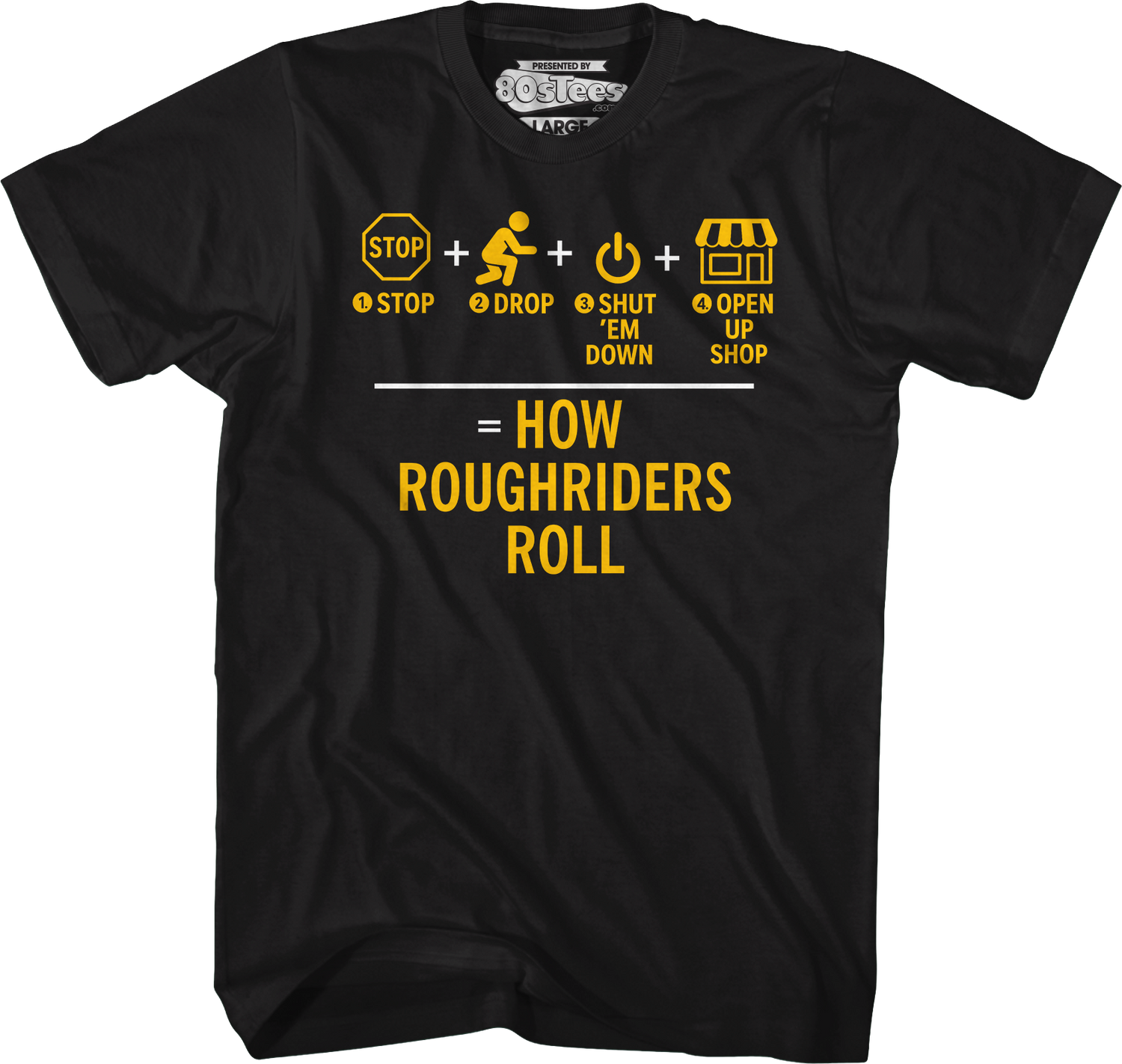 This 80sTees.com exclusive t-shirt features the “Ruff Ryders’ Anthem” lyrics Stop, Drop, Shut 'Em Down, Open Up Shop. The shirt reads How Roughriders Roll.