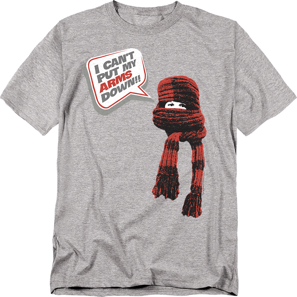 This Christmas Story t-shirt shows Randy Parker wrapped in a scarf and saying "I can't put my arms down!"