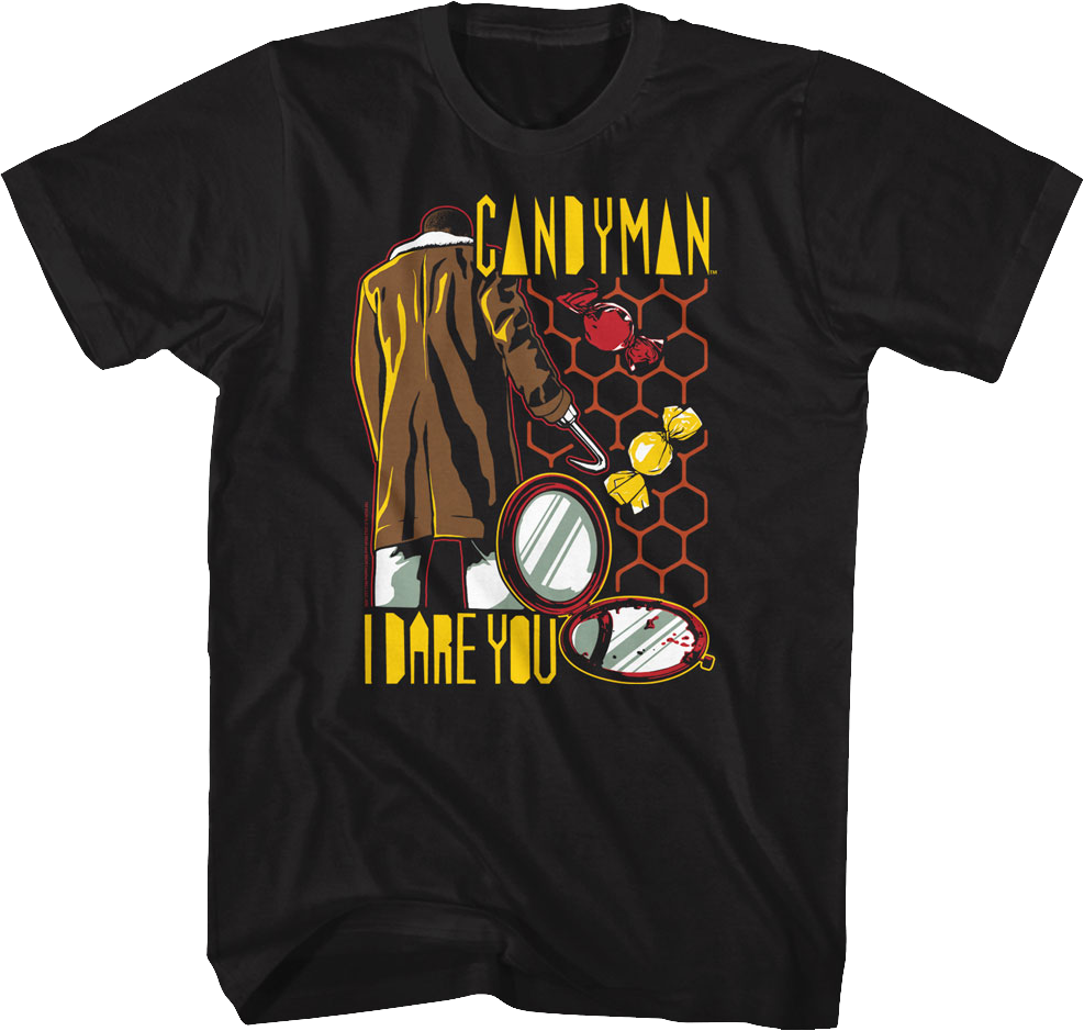 Candyman is a supernatural killer with a hook for a hand, who is easily summoned by those daring to repeat his name five times into a mirror. Let everyone know you are a fan of the horror icon when you wear this I Dare You Candyman T-Shirt.