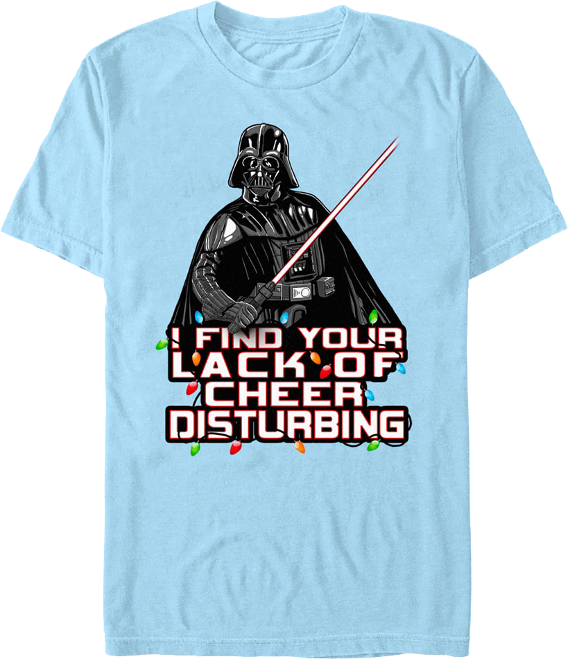 This Star Wars t-shirt shows Darth Vader posing with his lightsaber. The shirt reads "I Find Your Lack Of Cheer Disturbing", with the letters wrapped in Christmas lights.
