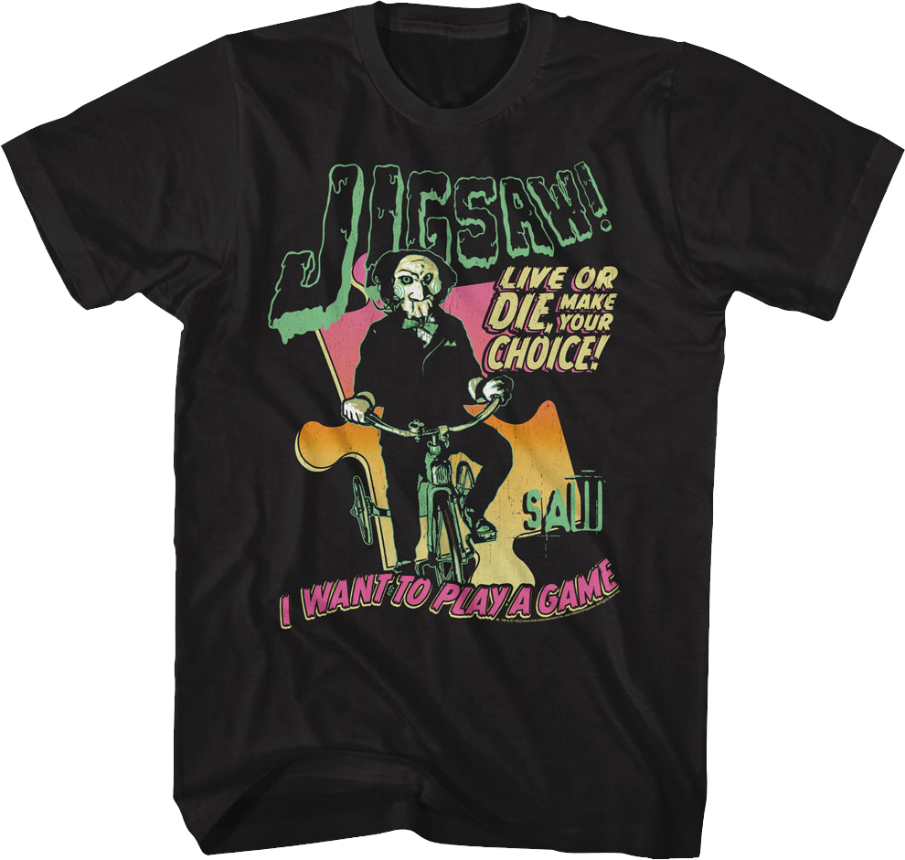 This Saw t-shirt shows Billy the puppet riding his tricycle in front of a giant puzzle piece. The shirt reads I Want To Play A Game. The shirt includes the Jigsaw quote, "Live or die, make your choice!"