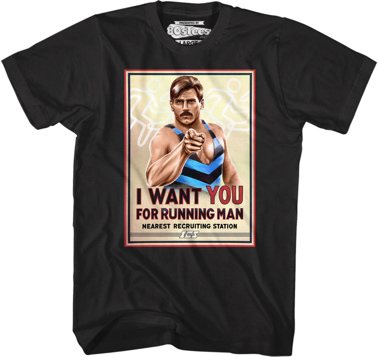 This Running Man t-shirt features an image of Captain Freedom in the famous Uncle Sam pointing pose. The shirt reads I Want You For Running Man. In the 1987 movie Running Man, Captain Freedom was a retired Stalker. When he refused to return to the show, the ICS network created digital body doubles of Captain Freedom, and Ben Richards, which were used to fake Richards' death on screen.