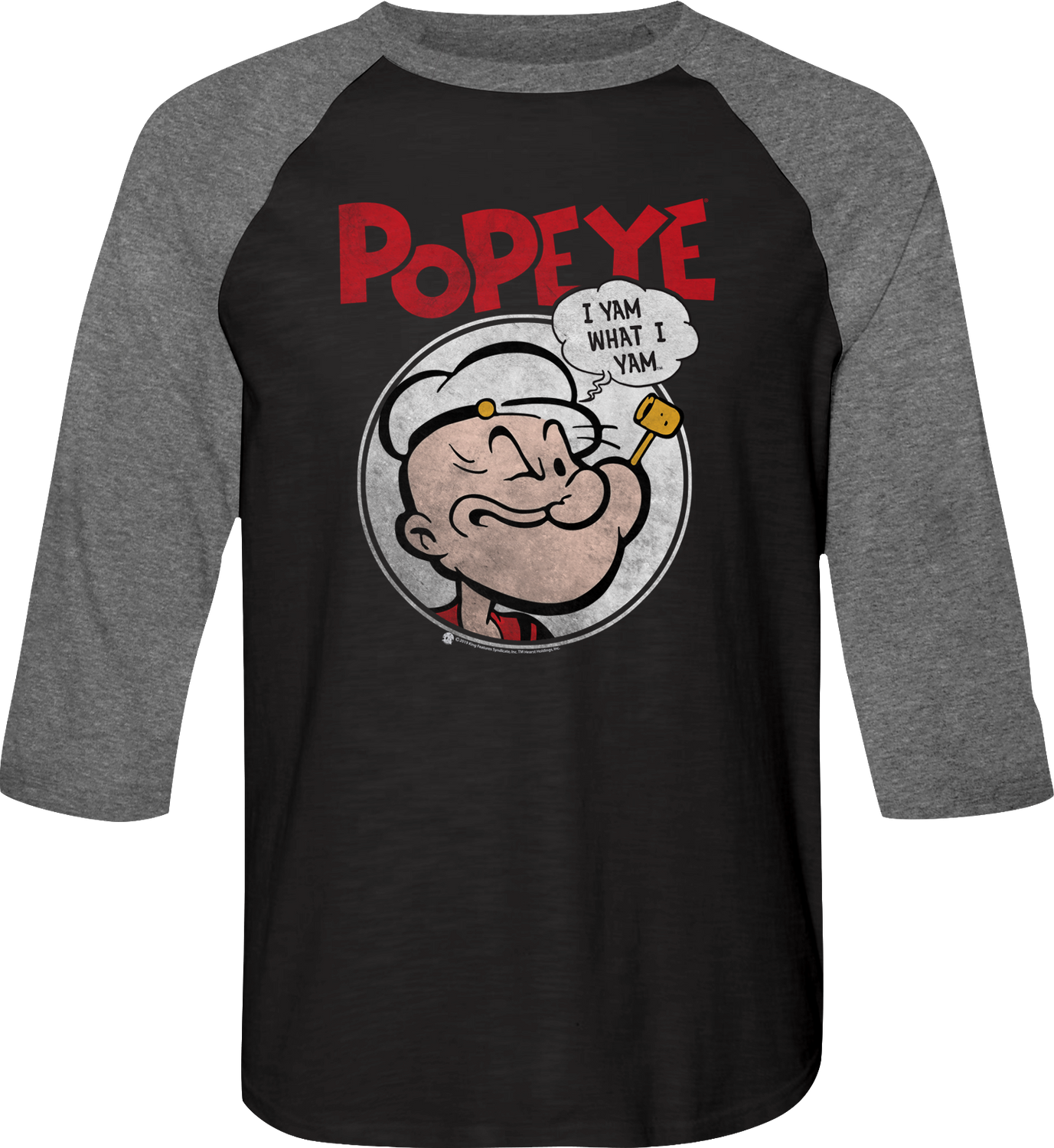 This Popeye raglan baseball shirt features an image of the sailor man with his iconic pipe. Popeye is seen saying his catchphrase "I Yam What I Yam".