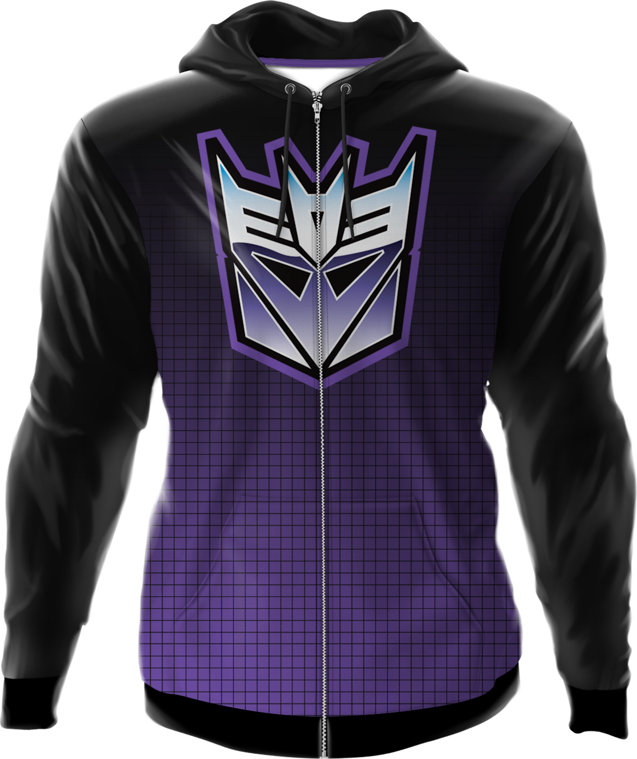 As a member of the first Generation of our line of Exclusive Premium Activewear with our Icon Fade design concept, it's fitting that this Decepticon Transformers Zippered Hooded Jacket features the grid pattern that every fan of the first Generation of Transformers remembers so fondly.