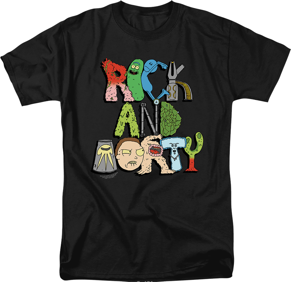 This Rick And Morty t-shirt features images from the hit series shaped to create a logo.