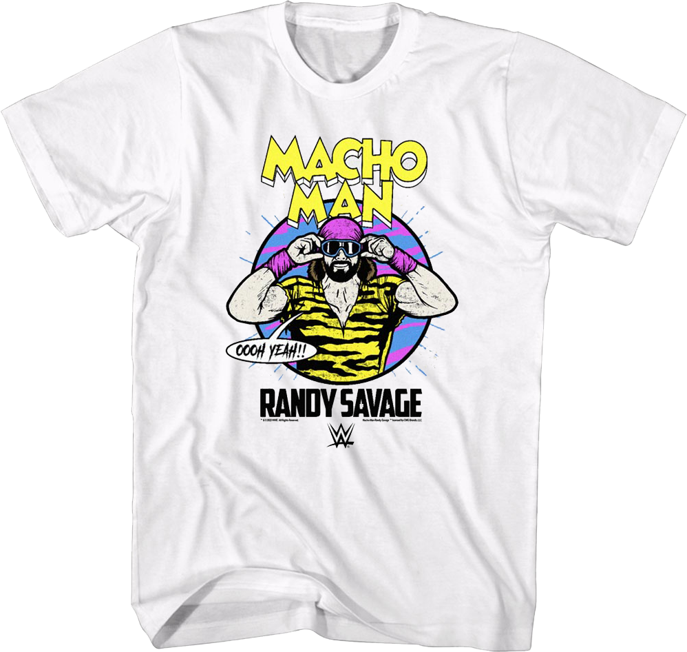 "Macho Man" Randy Savage is one of the most colorful competitors to ever step foot in a wrestling ring. This t-shirt shows Savage's usual ring entrance attire, including a bandana and sunglasses. Randy Savage wore these to the countless victories that made him a true icon in the sport of professional wrestling!