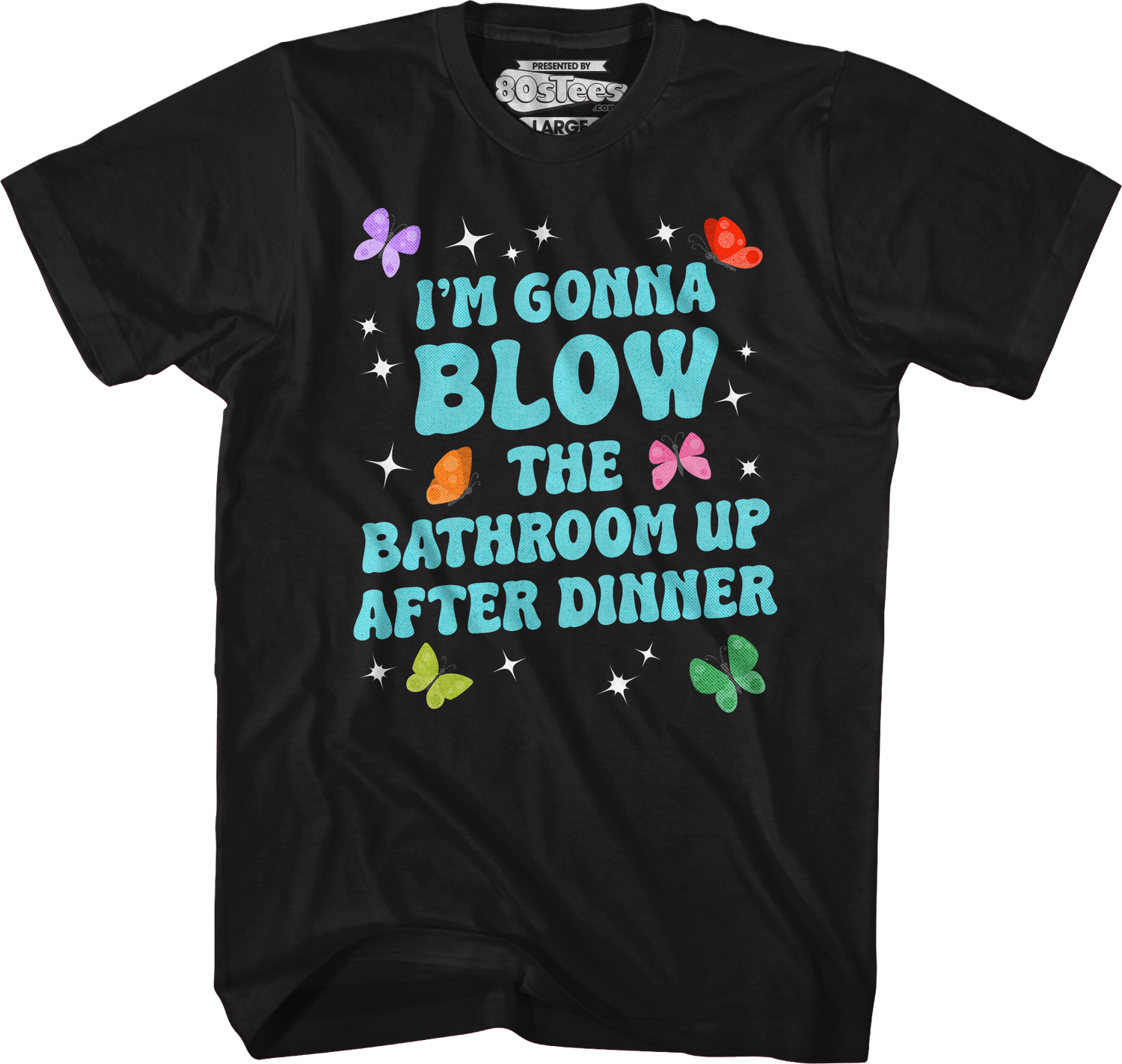 This 80sTees.com exclusive t-shirt is decorated with beautiful butterflies and sparkling stars. The shirt reads I'm Gonna Blow Up The Bathroom After Dinner.