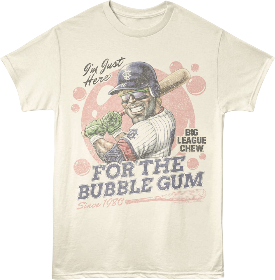 This Big League Chew t-shirt features an illustration of a baseball batter surrounded by bubble gum. The shirt reads "I'm Just Here For The Bubble Gum" and "Since 1980".