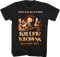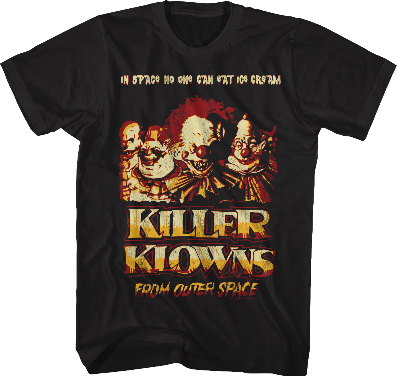 In Killer Klowns From Outer Space, evil aliens who resemble clowns land on Earth and set up a circus tent. Anyone who entered the tent would be trapped in cotton candy or shot at with a popcorn gun. This shirt shows four of the most popular killer klowns.