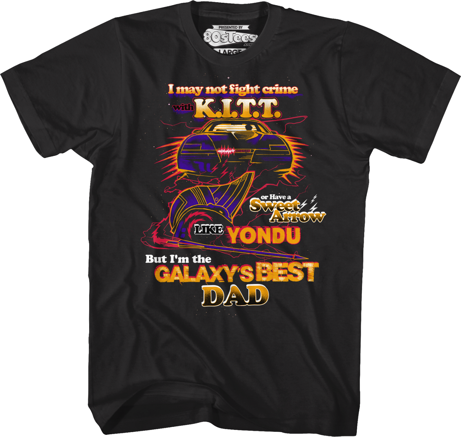 This t-shirt features images of Michael Knight's crime fighting partner, the Pontiac Firebird Trans Am known as K. I. T. T. and the space pirate Yondu's iconic hairdo. The shirt reads I may not fight crime with K. I. T. T. or Have a Sweet Arrow Like Yondu But I'm the GALAXY'S BEST DAD.