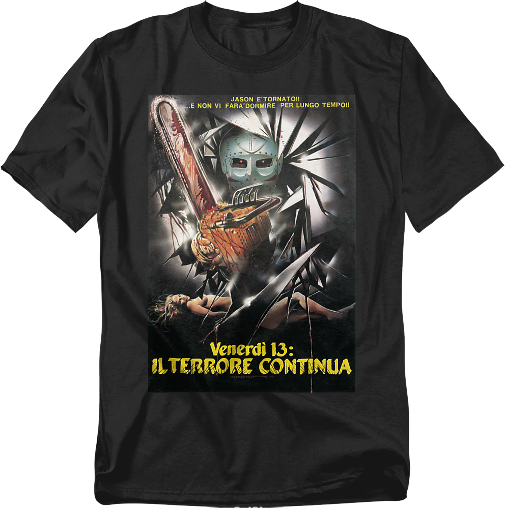 This Friday the 13th t-shirt features the Italian poster artwork for Friday the 13th Part V: A New Beginning.
