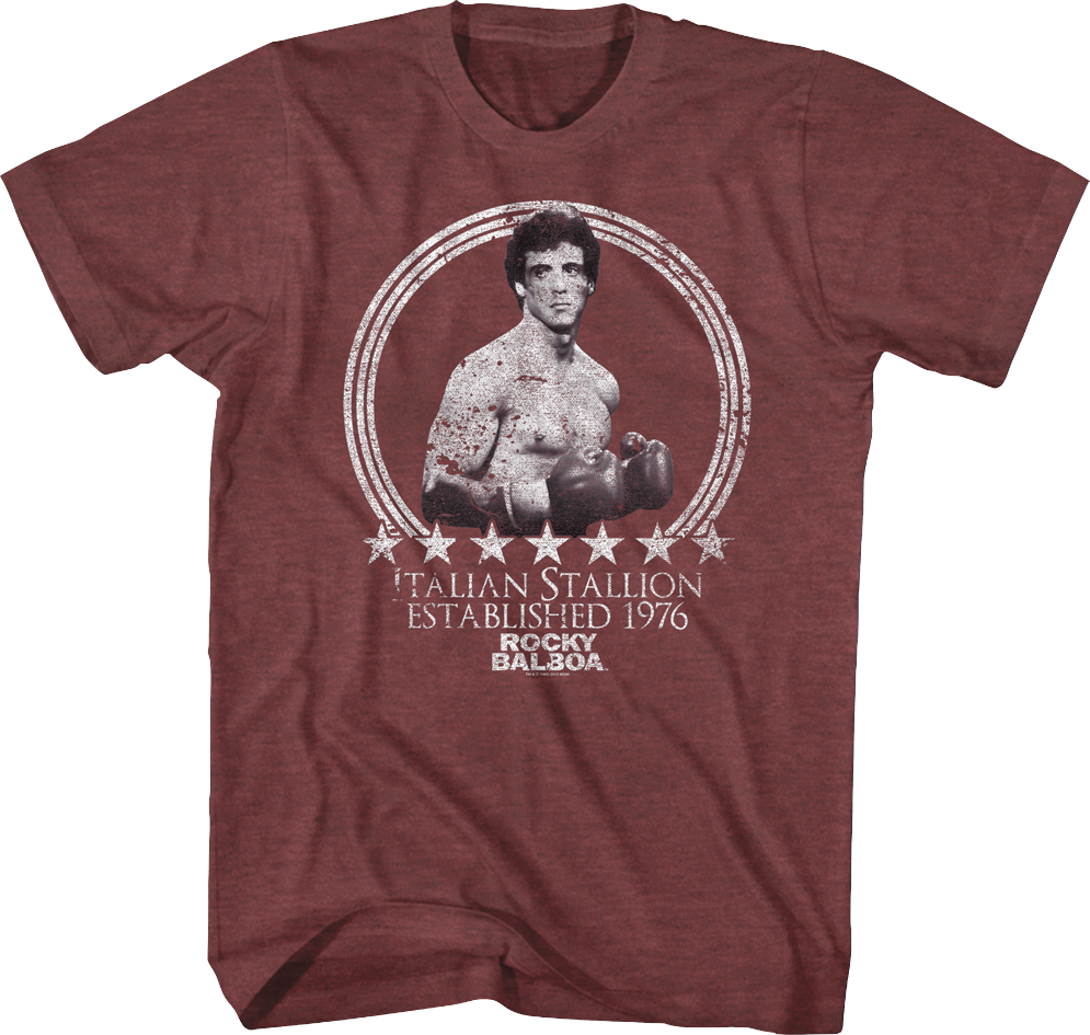 This Italian Stallion Rocky Balboa T-Shirt shows everyone's favorite underdog ready for his next bout. The shirt reads, "Italian Stallion Established 1976", which is the year that the first installment in the franchise was released. The shirt is distressed to look like you've been wearing it for years. Sylvester Stallone was nominated for best actor and best original screenplay at the Academy Awards for this film, which won for best picture.
