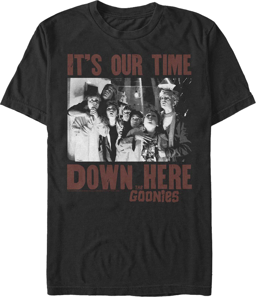 This Goonies t-shirt features a black and white photo of Andy, Brand, Mikey, Mouth, Data, Chunk, and Stef. The shirt reads It's Our Time Down Here.