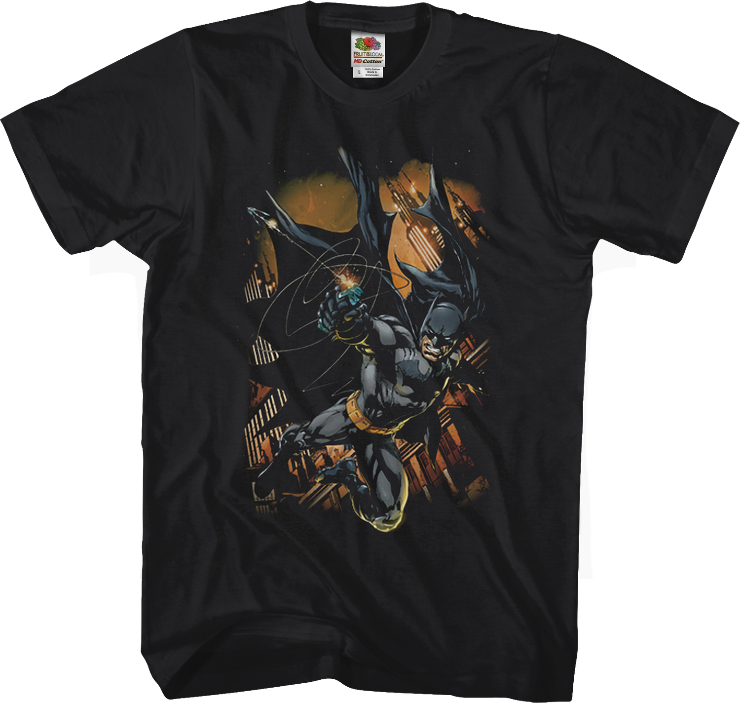 This Batman t-shirt features an image of the Caped Crusader flying over Gotham City with the use of his Grappling Gun. This iconic image of Batman was illustrated by Ivan Reis and appeared on the cover of the 2011 DC comic Batman #3.