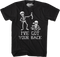 This 80sTees.com exclusive t-shirt shows a skeleton's bones collapsed on the ground. Another skeleton is holding up its spine. The shirt reads I've Got Your Back.