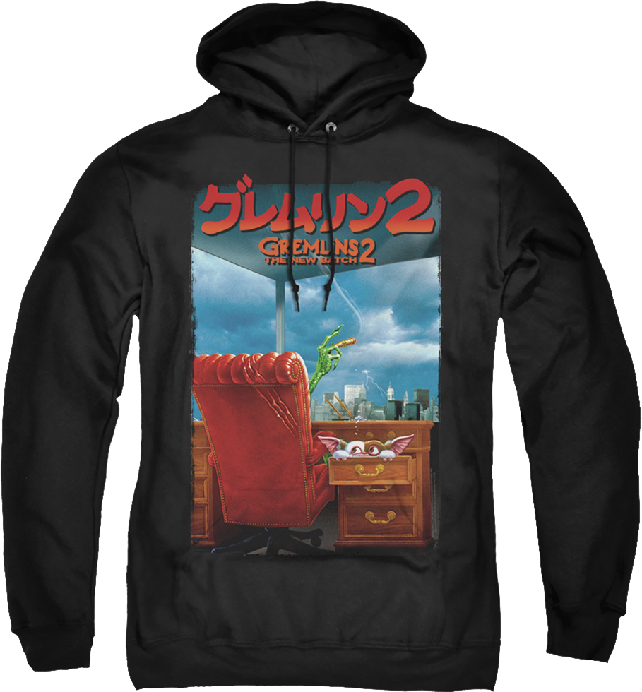 This Gremlins hoodie features a Japanese poster for the 1990 movie, "Gremlins 2: The New Batch." In "Gremlins 2: The New Batch", Gizmo once again spawned numerous small monsters. In the first Gremlins movie, the monsters threatened a small town. In the sequel, Gizmo multiplied in a skyscraper, and all of New York City was in danger!