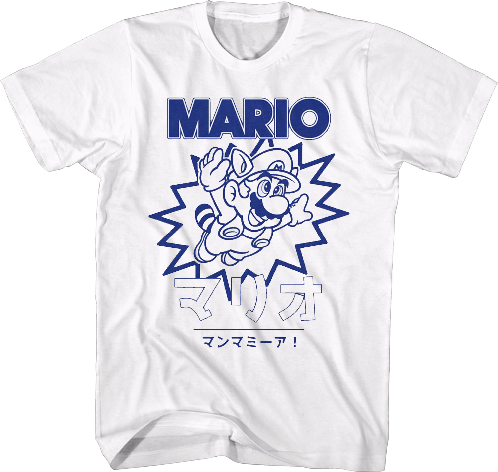 This Super Mario Bros. t-shirt shows Raccoon Mario flying into action. The shirt includes Mario's name in Japanese text.