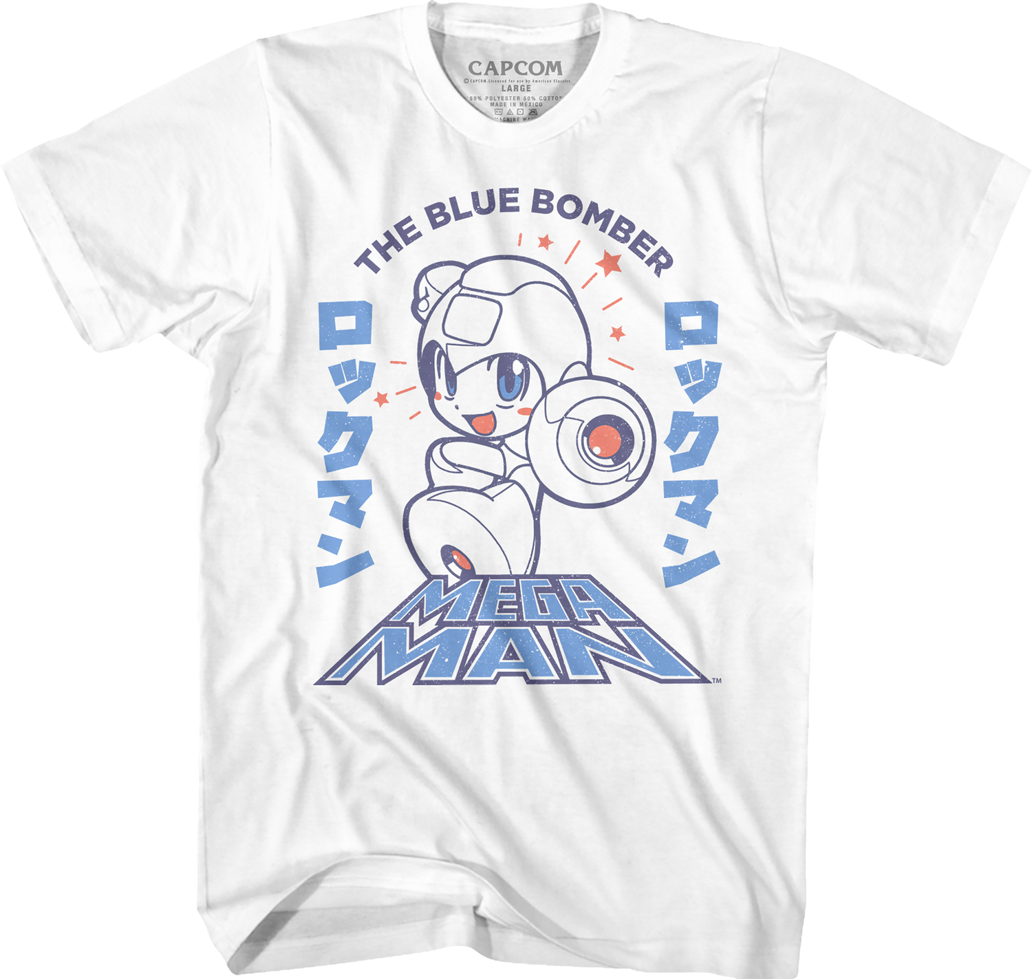 This Mega Man t-shirt shows "The Blue Bomber" ready to fire his Mega Buster. The shirt includes Mega Man's name in Japanese text.