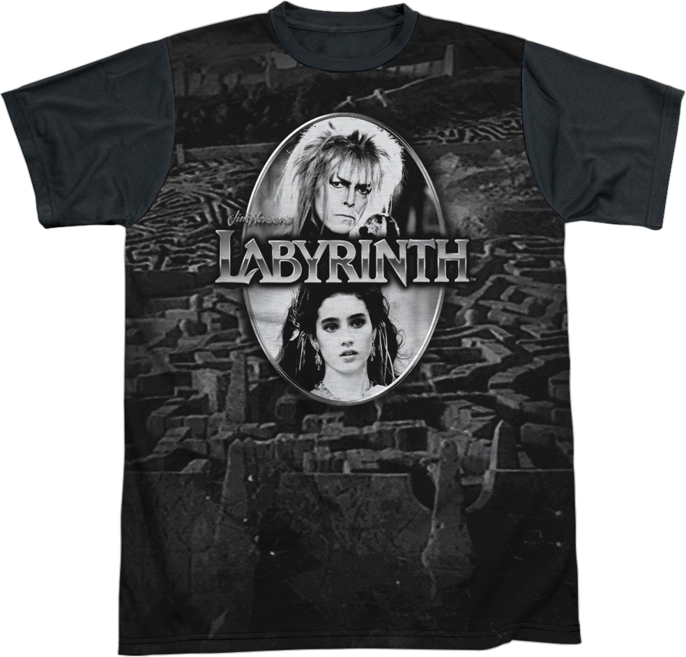 This Labyrinth t-shirt shows black and white images of Jareth and Sarah Williams positioned in front of the Goblin King's complex maze.