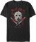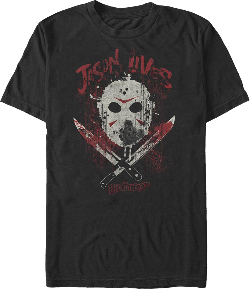 This Friday the 13th t-shirt shows crossed machetes covered in blood and Jason Voorhees' hockey mask. The shirt reads Jason Lives.