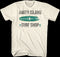 Amity, as you know means friendship. And, your friends at Amity Island Surf Shop want to help you escape from any twenty-five foot shark before its black eyes roll over white. That's why they offer high speed surf boards. The screams you hear on these boards aren't awful, but rather joyous. Disregard any billboards you see for these surf boards with a shark fin painted in by hooligans. No shark could catch you hanging ten on these boards. Now, you can show off your love for Amity Island and the classic movie Jaws with this Amity Island Surf Shop shirt.