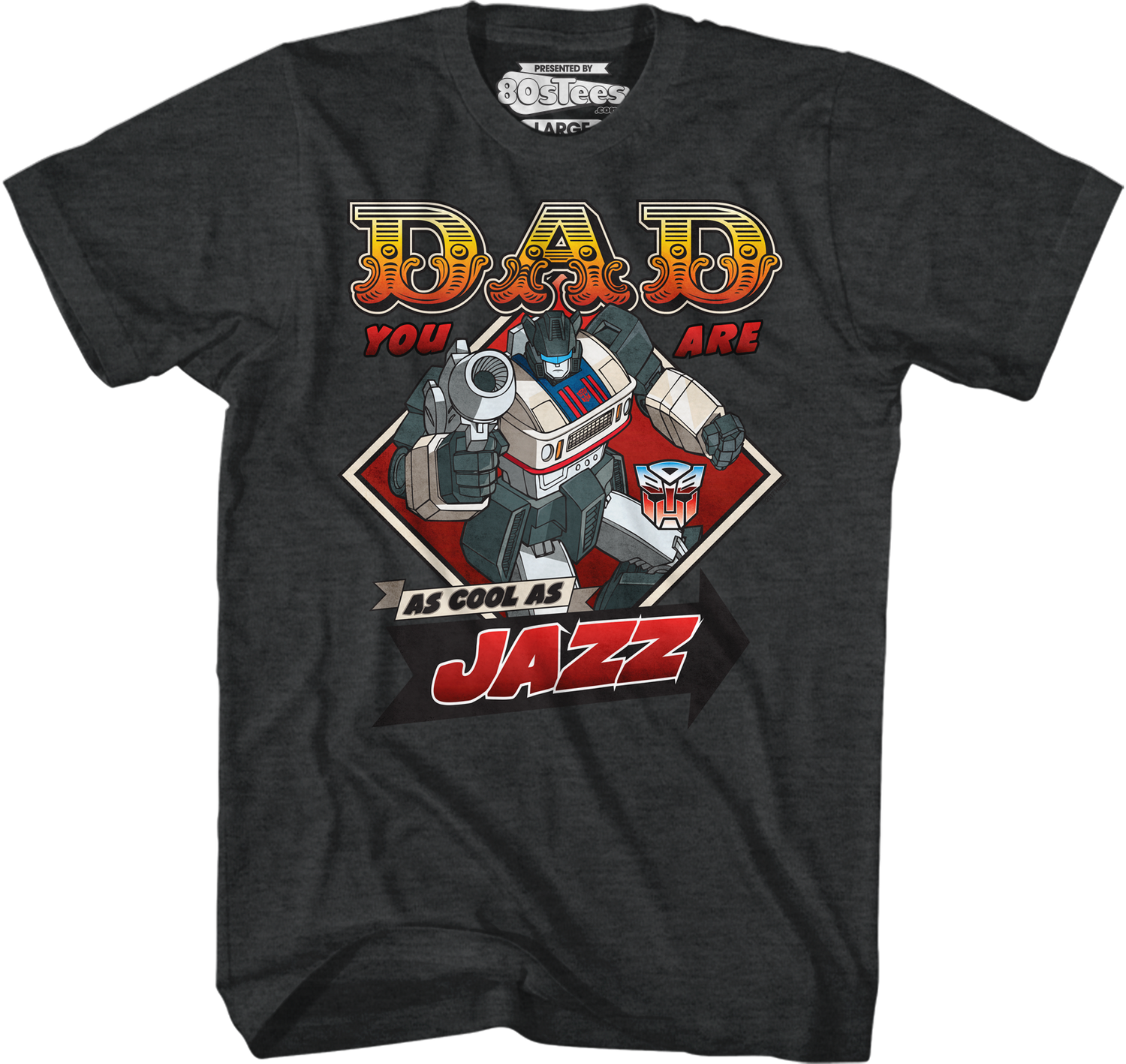 Calm, collected and cool, Jazz is the first lieutenant of the Autobots and one of the most popular characters from Transformers. This Father's Day, let your dad know that he is just as cool and popular as Jazz with this 80sTees.com exclusive Father's Day Transformers t-shirt.