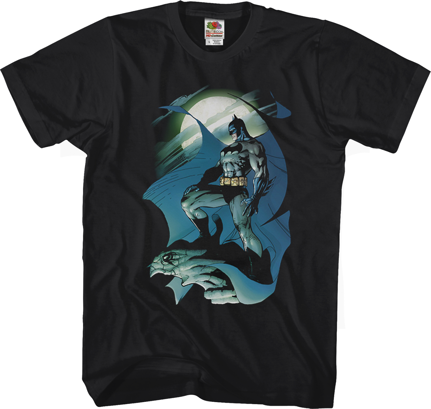 This Batman t-shirt shows the Dark Knight standing in the glow of the moonlight. This iconic image was illustrated by Jim Lee and taken from the DC comic Batman vs Superman.