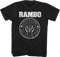 This Rambo t-shirt features a John Rambo seal for the 1982 movie First Blood. The seal is designed to look like the famous Ramones eagle logo.