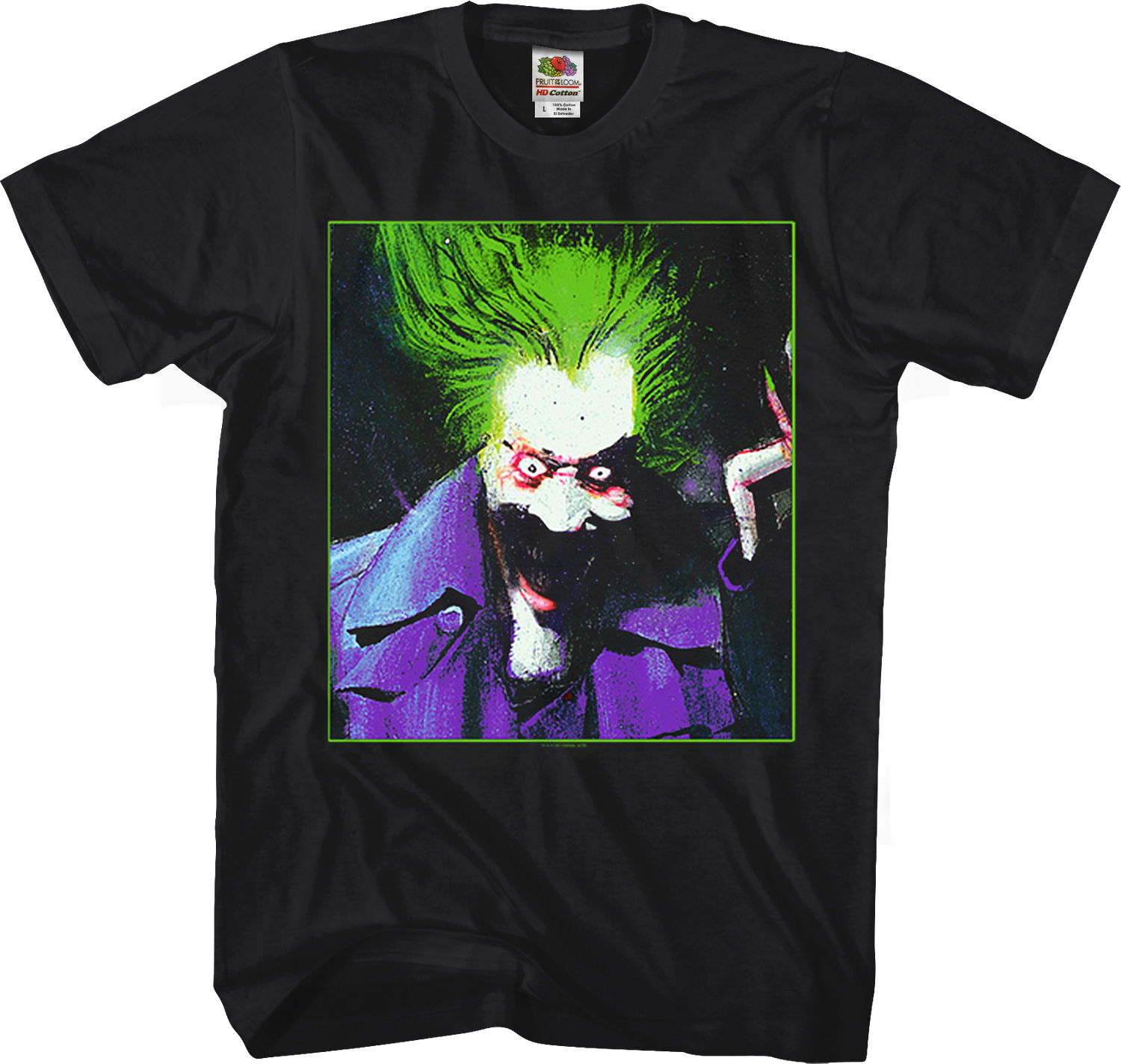 The Joker debuted in Batman #1 in 1940. In this issue, the Joker announced his crimes over the radio, captured Robin, and nearly escaped the grasp of the Dynamic Duo. Since his first appearance, the Joker has more deranged, more driven to cause chaos, and increasingly more popular. The painting on this t-shirt captures the madness that dwells inside of the Joker.