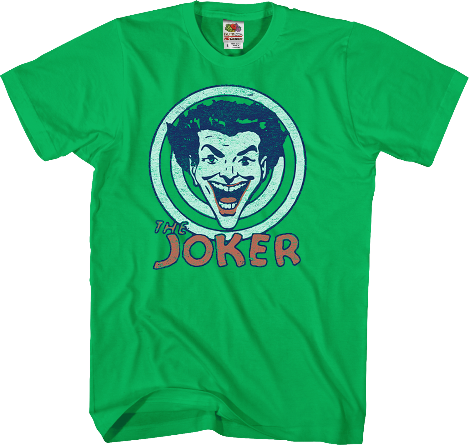 This Batman t-shirt features an image of the Joker's head in a spiraling target. The Joker is instantly recognizable with his white face paint, green hair, and wide, maniacal smile.
