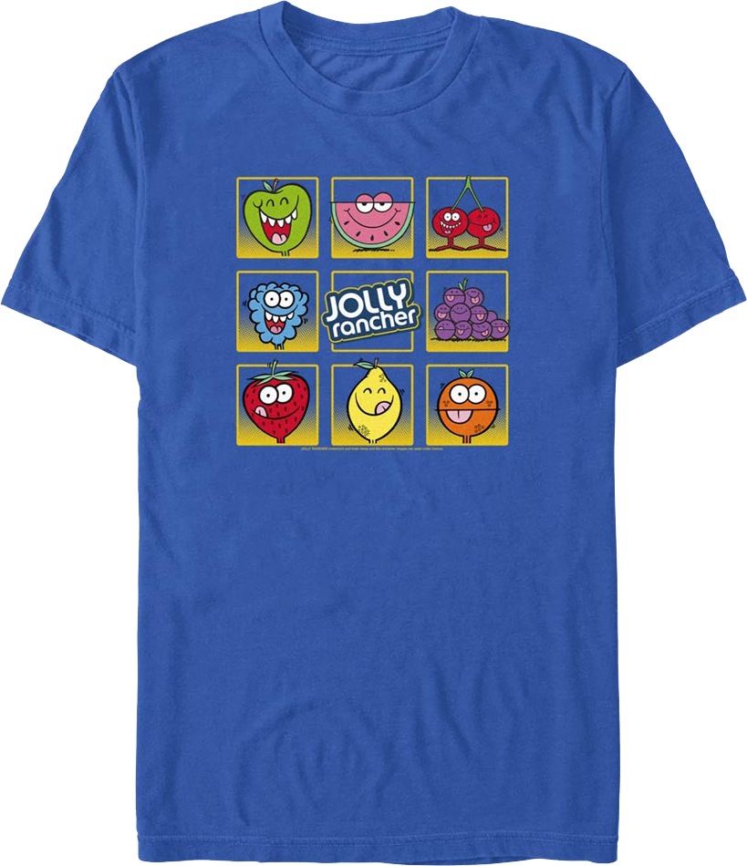 This Jolly Ranchers t-shirt features the most popular flavors for the hard candy. The flavors include green apple, watermelon, cherry, blue raspberry, grape, strawberry, lemon, and orange.