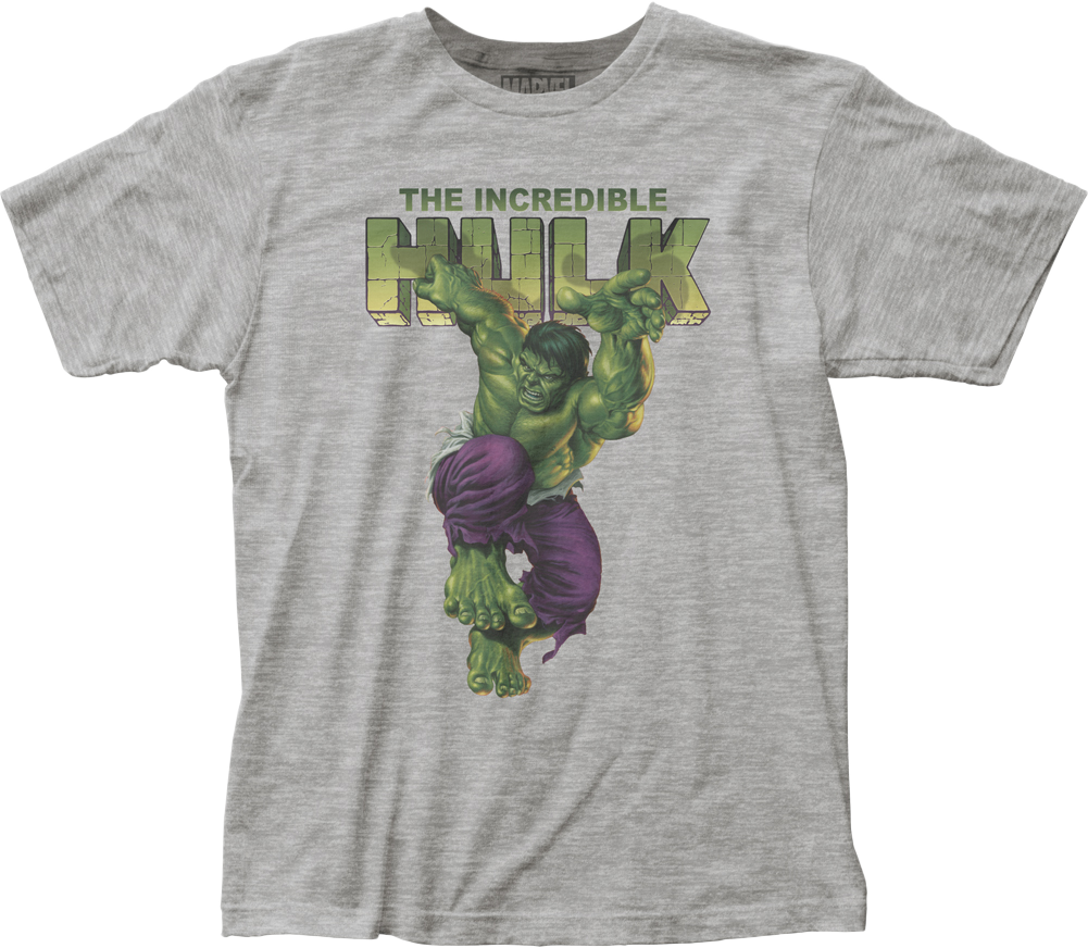 This Incredible Hulk t-shirt shows the green monster jumping into action.