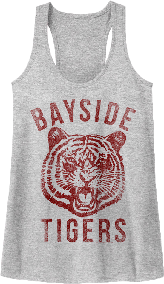 Bayside and it's hilarious students were seen on the popular teen comedy Saved By The Bell. Now, you can show that you are a fan of the series with this tank top that shows the Bayside tiger mascot.
