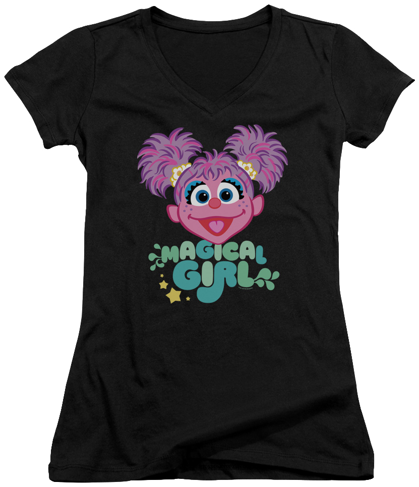 This Junior Magical Girl Sesame Street V-Neck Shirt features the face of the adorable fairy in training. Abby Cadabby debuted in the 37th season of Sesame Street and immediately became a fan favorite. Abby can pop out of thin air, float when she's happy, and turn items into pumpkins. She comes from a divorced family and teaches children about living in two households. Abby Cadabby is simply magical!