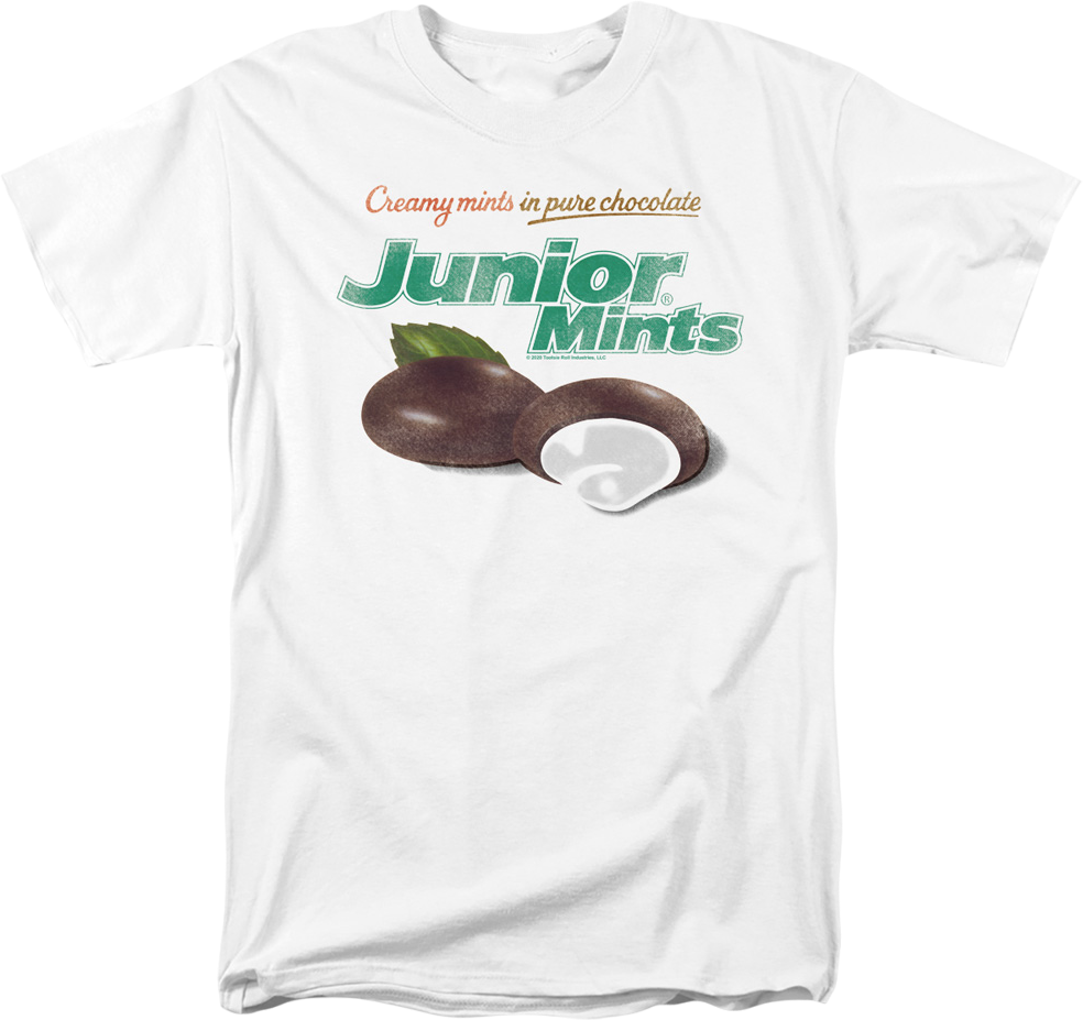 Junior Mints are a candy brand that offer both the rich taste of dark chocolate and the cool, fresh flavor of peppermint. The candy consists of small rounds of mint filling inside a sweet chocolate coating. Junior Mints may be small, but are big on flavor, and have remained delicious and popular since its introduction in 1949. The candy took on a whole new level of popularity after appearing in the Seinfeld episode "The Junior Mint." Everyone will instantly know you are a fan when you wear this Junior Mints T-Shirt!
