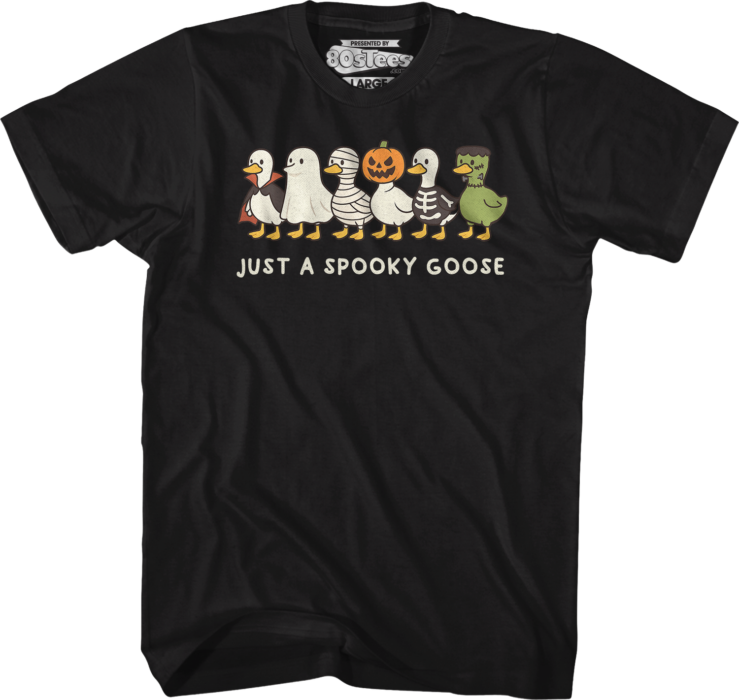 This 80sTees.com exclusive t-shirt shows a goose dressed up in spooky costumes for Halloween. These costumes include Dracula, a ghost, a mummy, a Jack-o'-Lantern, a skeleton, and Frankenstein's monster. The shirt reads Just A Spooky Goose.