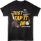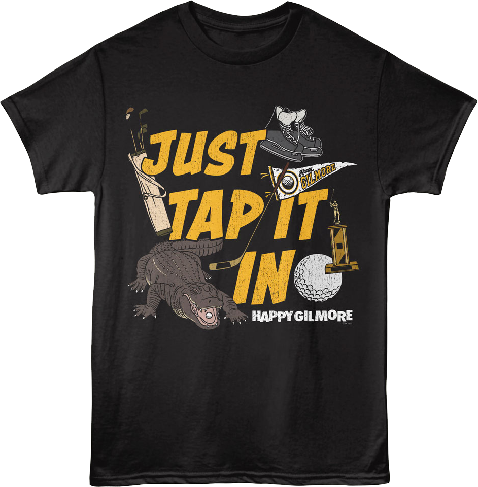 This Happy Gilmore t-shirt features a collage that includes golf clubs, ice skates, an alligator with Happy's golf ball in its mouth, a hockey stick, a Happy Gilmore banner, a golf ball, a golf trophy. The shirt reads Just Tap It In.