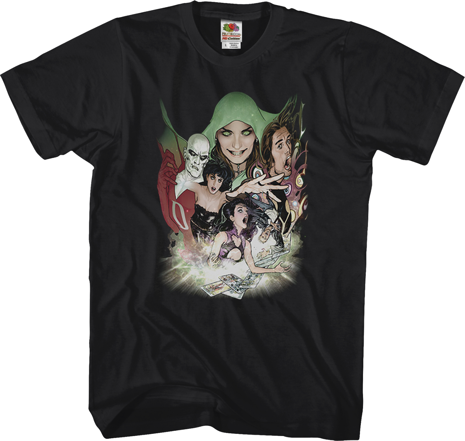 This t-shirt features the cover artwork for Justice League Dark Vol. 1 #1 titled "In the Dark, Part One: Imaginary Women". The artwork shows Deadman, John Constantine, Madame Xanadu, Shade the Changing Man, Zatanna, and Enchantress.