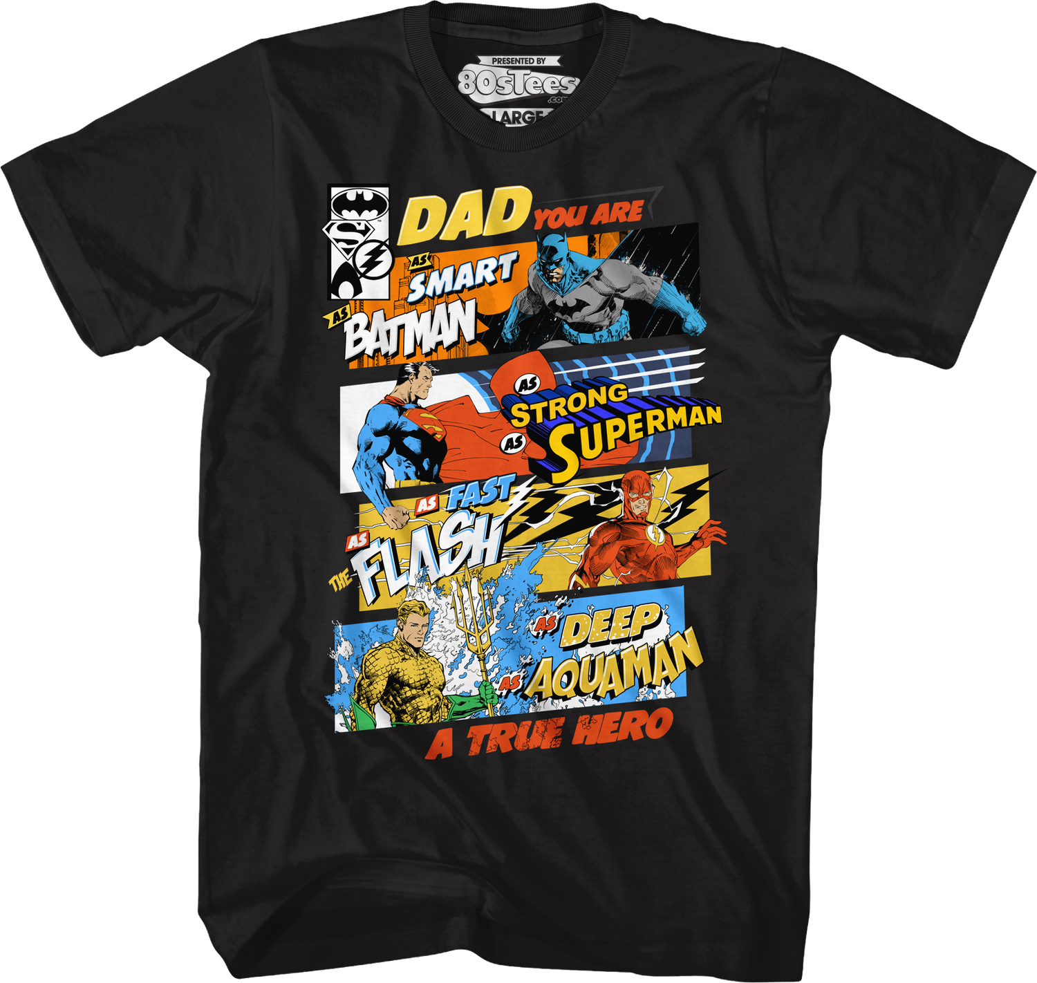 The shirt features images of the iconic characters Batman, Superman, Flash, and Aquaman. The shirt reads Dad You Are As Smart As Batman, As Strong As Superman, As Fast As The Flash, As Deep As Aquaman, A True Hero.