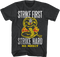 Strike First, Strike Hard, No Mercy is a ruthless way of teaching for Sensei John Kreese of the Cobra Kai Dojo. This is known as the study of the Way of the Fist, and the teaching appears on this Karate Kid Cobra Kai t-shirt, along with the Cobra Kai logo. Students of the Cobra Kai are ready to strike first on a beach, strike hard outside of a Halloween party, and show no mercy at the All-Valley Karate Tournament.