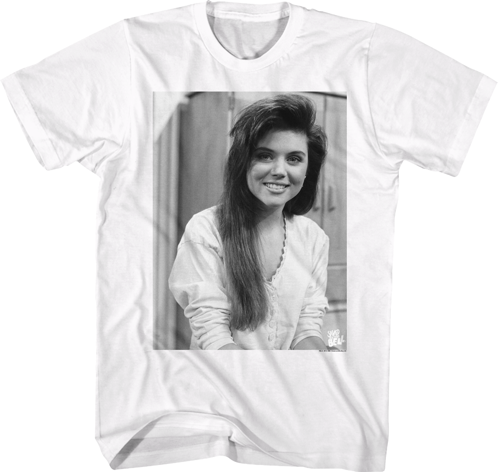 This Saved By The Bell t-shirt features a black and white portrait of one of the most popular students at Bayside High School, Kelly Kapowski.